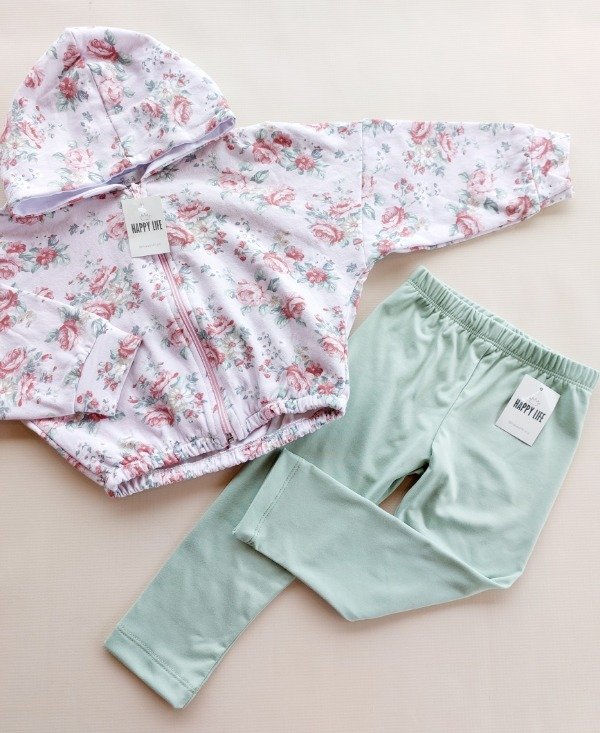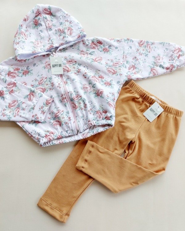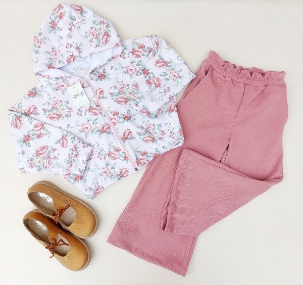 Campera Magui Frisa elastizada, color rosa pálido con estampa de flores rojas, mangas overside con capucha y cierre super canchera para armar tu outfit con calza, palazo, jeans.
