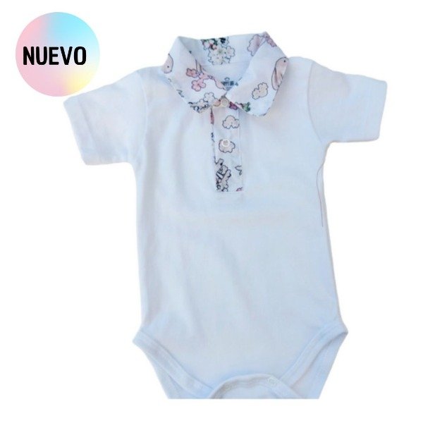 Body Dani diseñado en Jersey con cuello camisa estampado en conejitos primaverales fondo blanco.