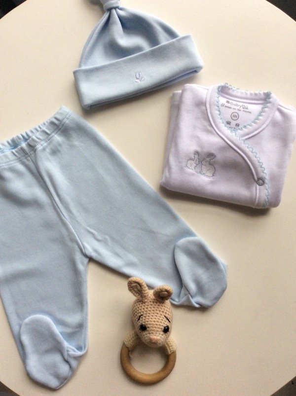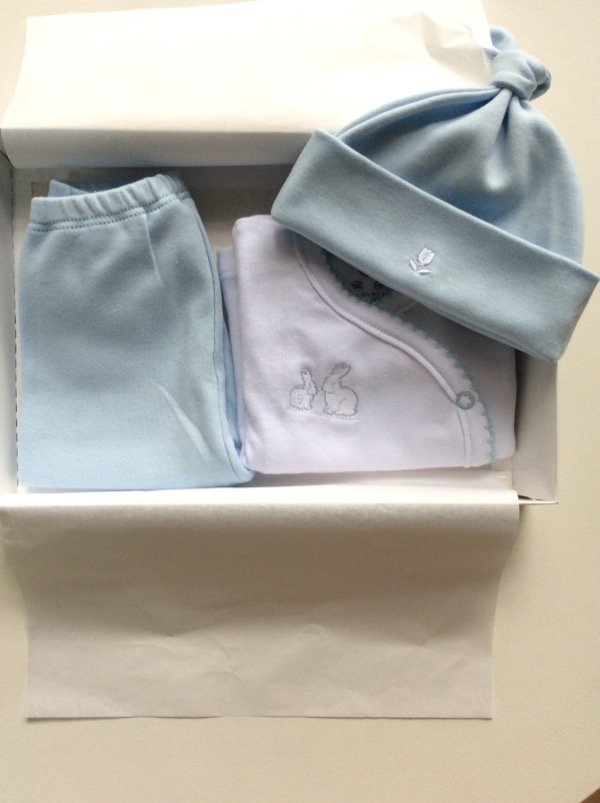 Ajuar Conejitos compuesto por 3 piezas una batita blanca con broches en frente al tono con el borde en picot celeste, gorrito nudo celeste con bordado al frente y ranita celeste con piecito, diseñado en algodón pima hipoalergénico acompañado en su caja sumamente delicada ideal para regalo.