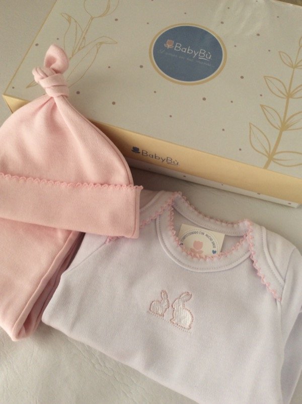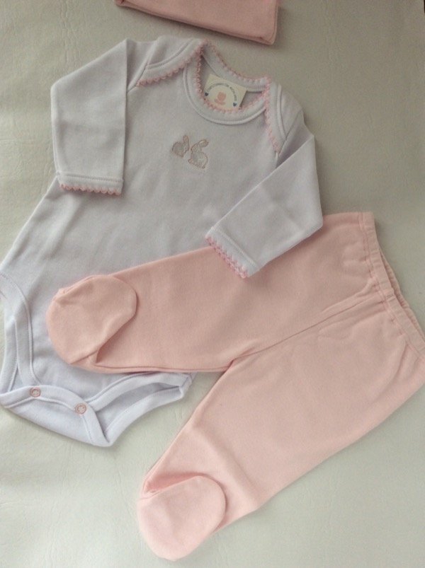 Mamá coneja confeccionado en Algodon Pima hipoalergénico Súper suave al tacto para la piel del bebé, este Ajuar se conforma en 3 piezas, Body ranita con pie más gorrino nudo, encolor rosa pastel al tono con el bordado de la coneja y el picot, todo estén hermoso Ajuar se presenta en cajita box ideal para regalo.