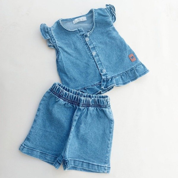 Conjunto Sofi Confecciono en Jean elastizado dos pieza, camisa con delicado vuelitos en hombros y detalle de vuelo en la cintura, se abotona al frente, con detalle de eco cuero en borde inferior, combinado con su short al tono, con bolsillos a su lados.