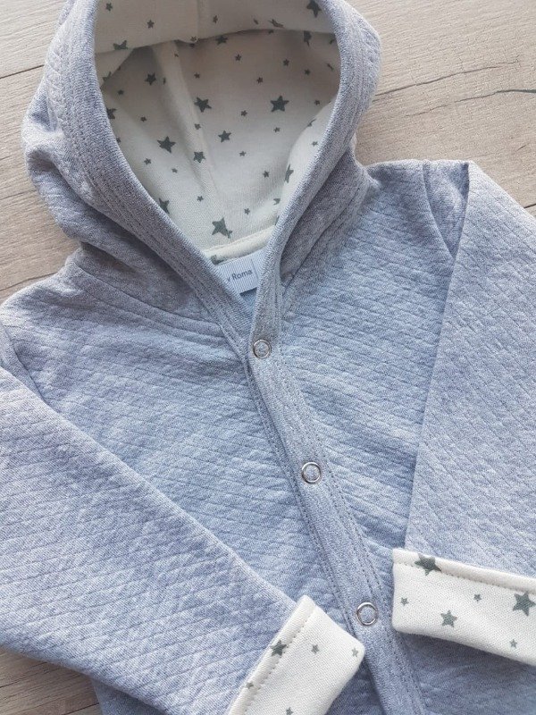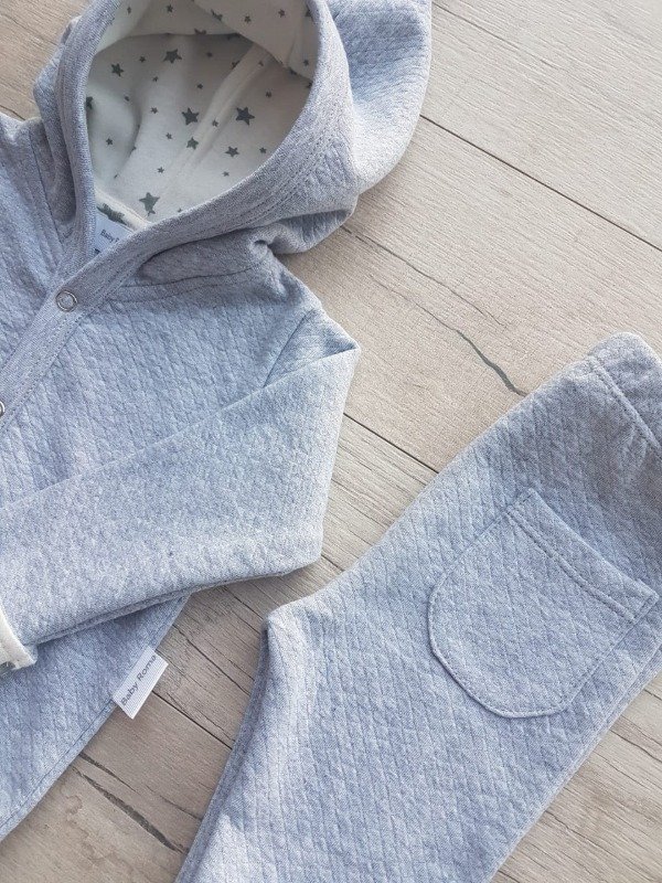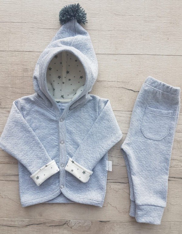 Conjunto Matelasse - Gris Melange, diseñado en Interlook estampado, con detalle de pompón de lana al tono en capucha, con botones y bolsillos traseros en pantalón.