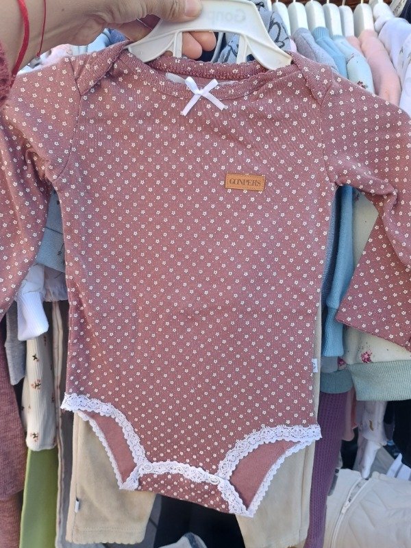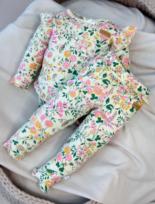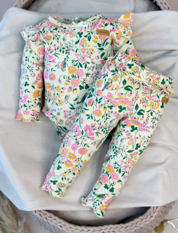 Body Americano floreados confeccionado en Reeb de algodón con cuello americano permitiendo cambiarlas a las bebas desde los hombros prácticos, con detalles en picot y broches en entre pierna, combinado con Pantalón Tokio en Reeb súper canchero o en Plush de algodón.