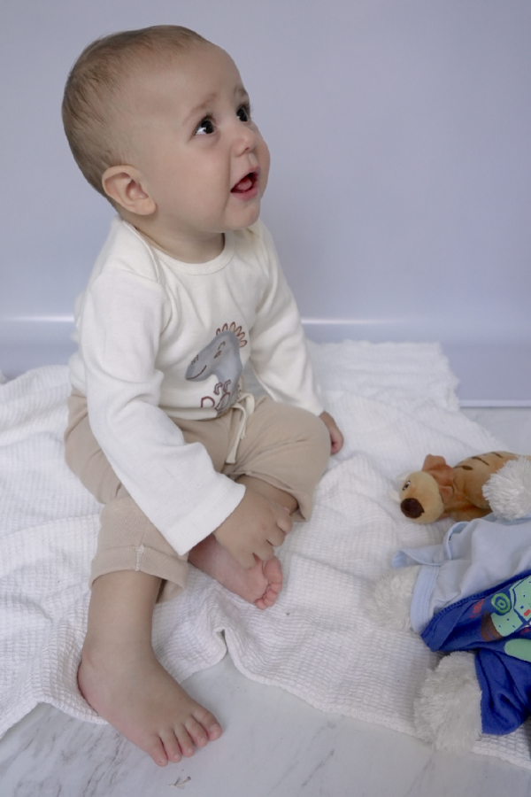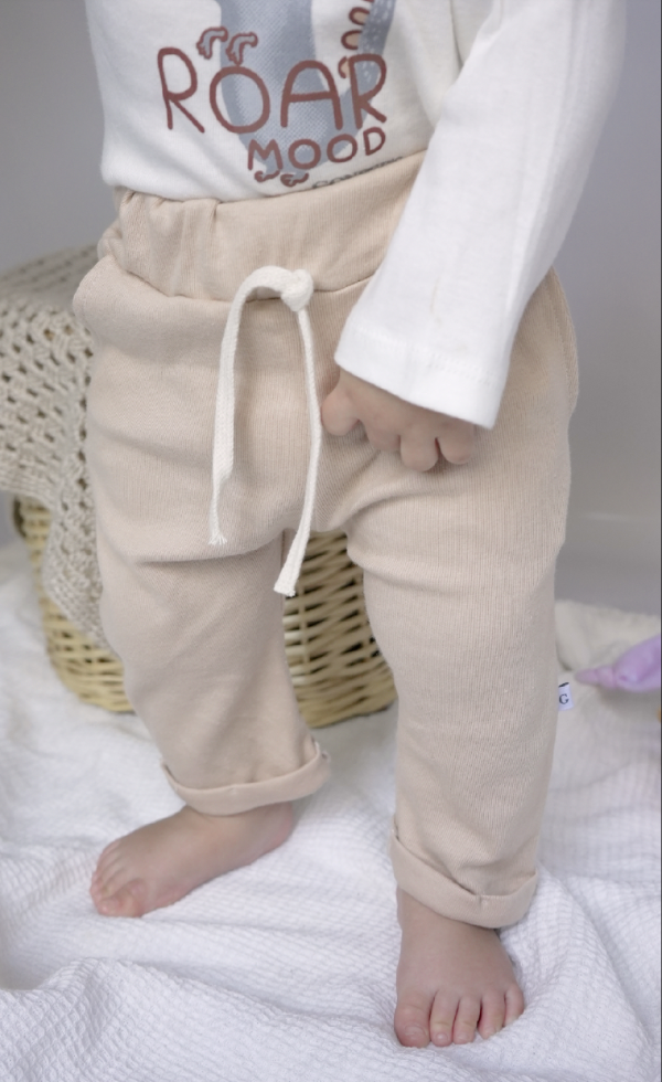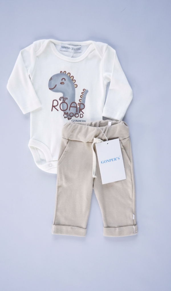 Body Americano Roard confeccionado en Reeb de algodón con estampa en frente, combinado con Pantalón Tokio en Reeb color Beig súper canchero, con bolsillos elástico en cintura más cordón ajustable en la cintura.