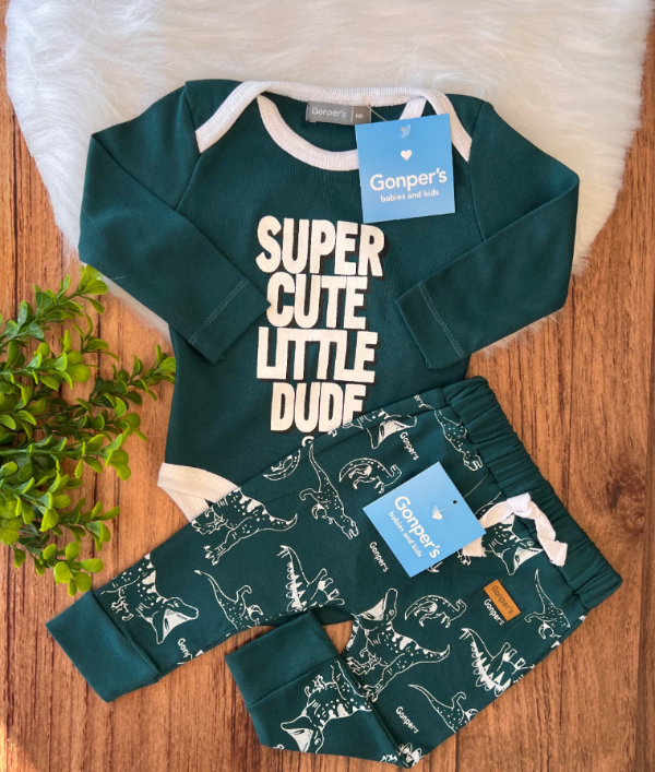 Dúo con estampa de Super Cute Little Dude, con pañalero con dinos, cordón en cintura.
