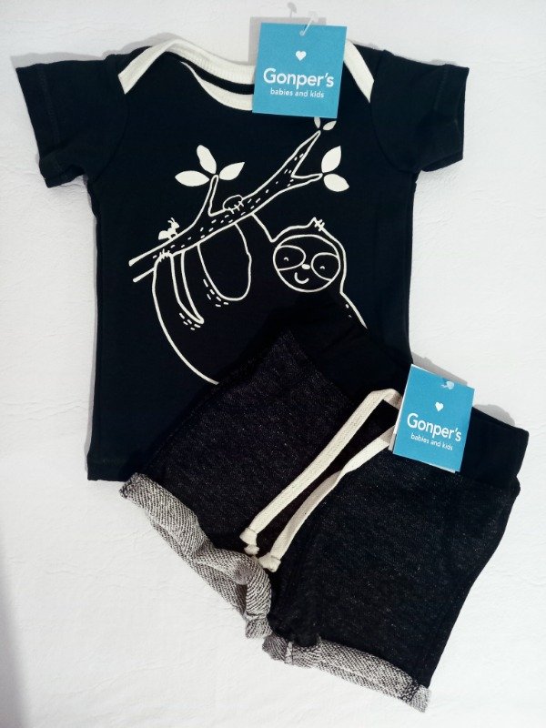 Dúo Remerita Perezoso diseñado en Reeb de Algodón, cuello americano para facilitar el momento de cambiar al bebé, combinado con un shortcito rustico jaspeado negro con detalle de cordón en la cintura, estampa y cuellito de la remerita al tono, super fresco para este verano.