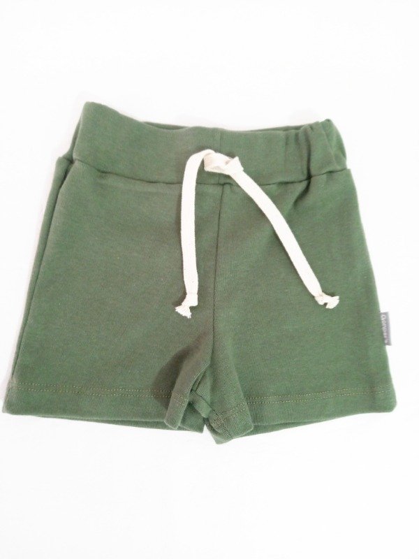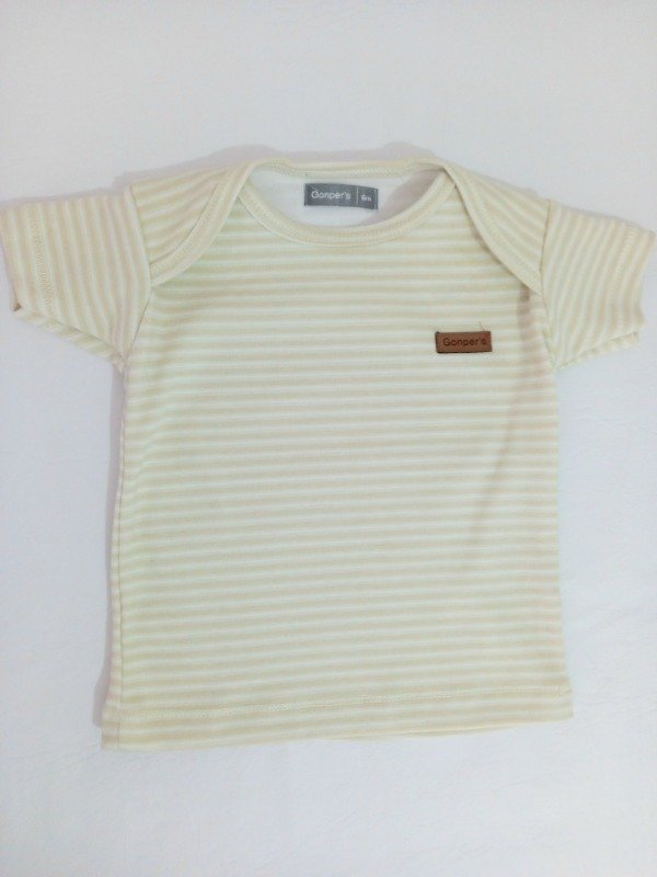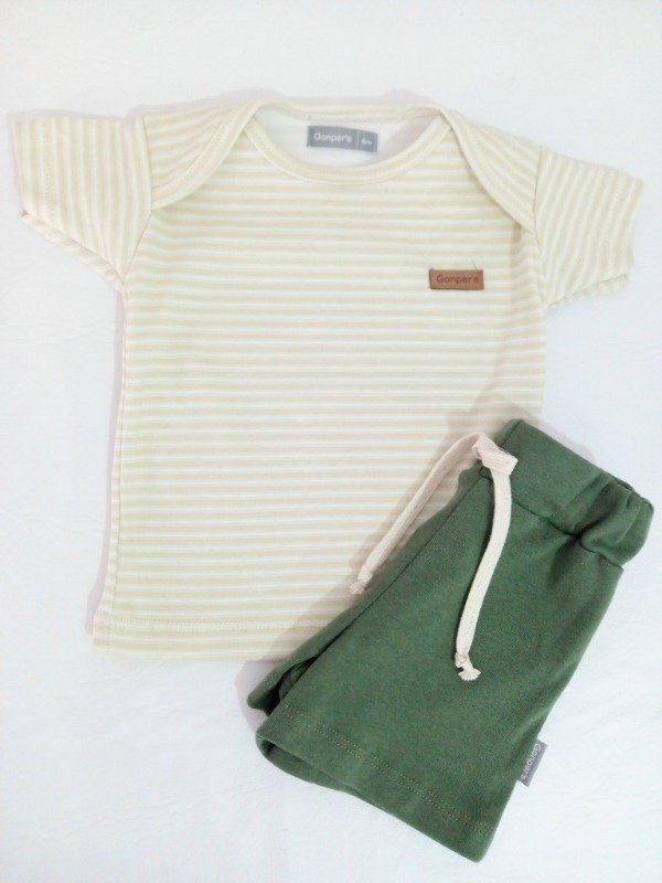 Dúo Remerita Brandon a Rayas color Beig, diseñado en Reeb de Algodón peinado 30.1, cuello americano para facilitar el momento de cambiar al bebé, combinado con un shortcito rustico Verde con detalle de cordón en la cintura, super fresco para este verano.