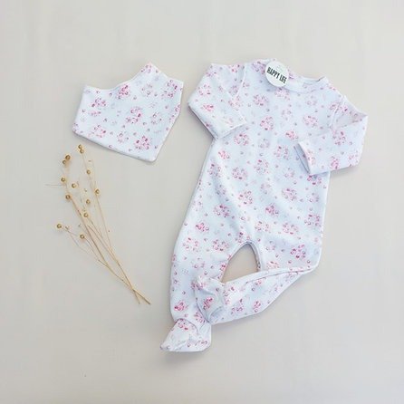 Enterito diseñado en Algodón Interlock , con delicada estampa en flores detalle de broches importados para su apertura al tono con el fondo natural en la espalda y entrepierna.