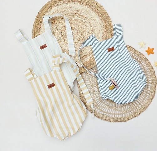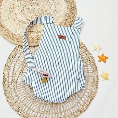 Este encantador enterito bombachón es una prenda perfecta para los días de verano. Confeccionado en lino, asegura frescura y suavidad para la piel delicada de los bebés. Además, viene acompañado de un práctico portachupetes a juego con rayas azul, que añade funcionalidad y estilo al conjunto.