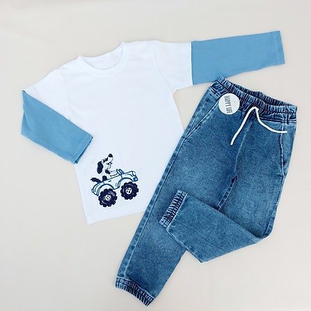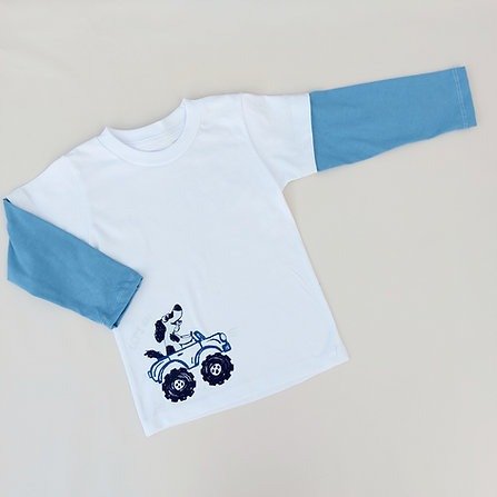 Remera confeccionado en Jersey, con delicada estampa en DTF y mangas en color celeste combinada con estampa.