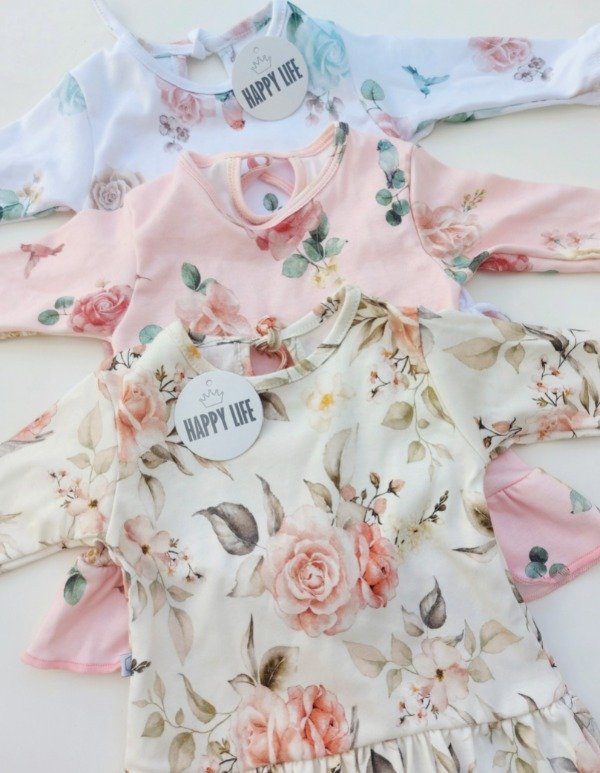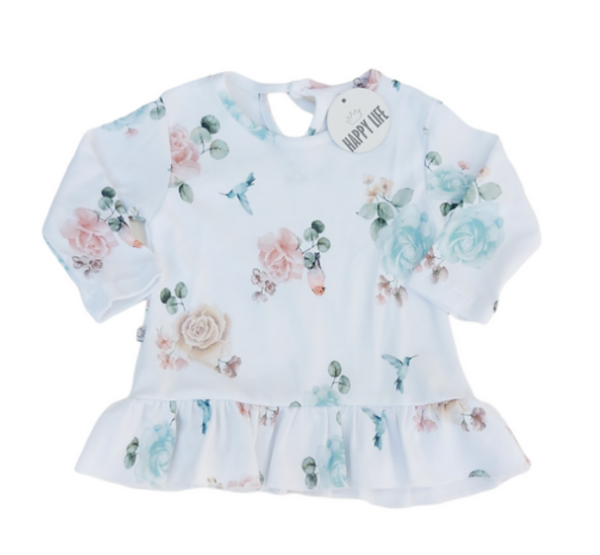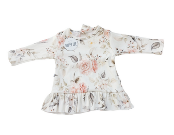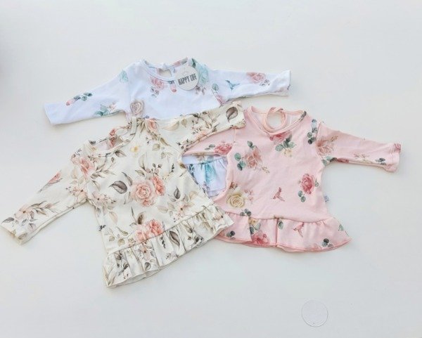 Remera Alegría se presenta con diseño floreado en tres colores y con detalles de vuelos.