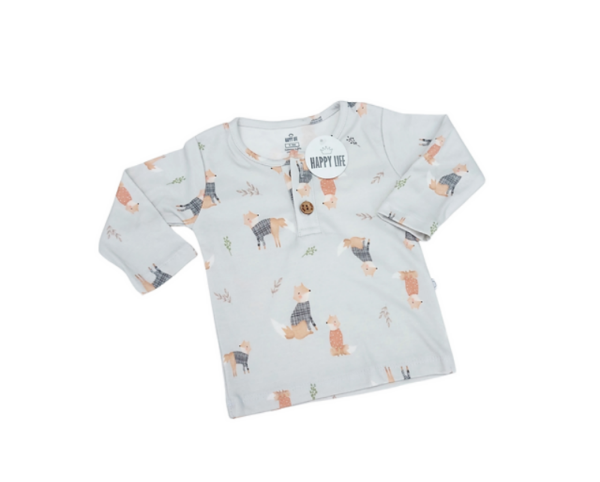 Remera Zorritos super divertida su estampa, con botoncitos de madera en frente que la hace re canchera, por sus colores la podes combinar muy bien con otros colores, fondo gris claro.