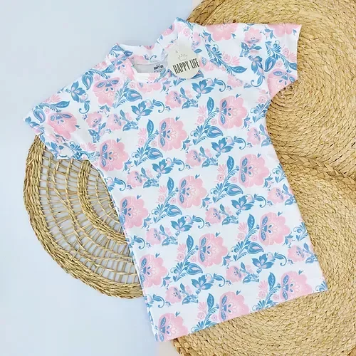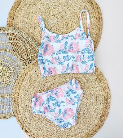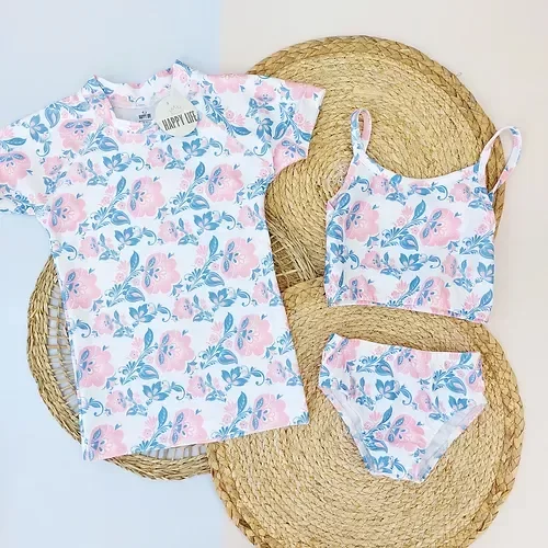 Traje de Baño en 3 piezas UV conformado por Remera + Bikini en dos piezas, todo con protección "UV" factor 50, estampado en flores fondo blanco muy delicado diseño, combínalo y armar dos trajes de baño.