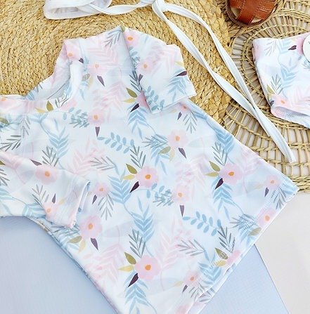 Remera con protección "UV" factor 50, estampado en flores fondo blanco muy delicado diseño, combínalo y armar dos trajes de baño.